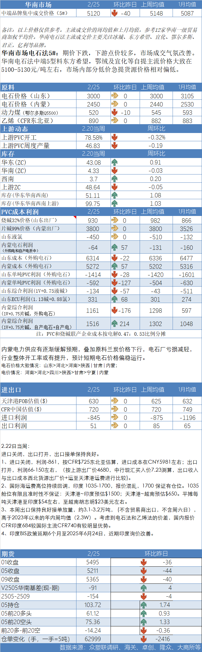 • 期货市场:截至2月25日,PVC主力V2505合约下午收盘价5211元/吨,跌幅0.95%,结算价5232元,持仓103.7万手,环比增加17407手,成交量76.2万手。